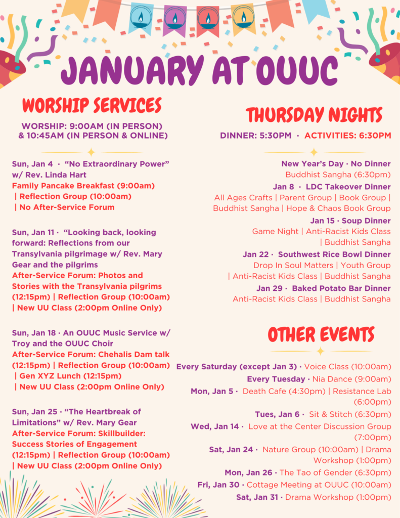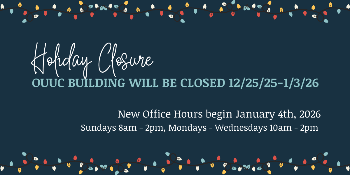Home Holiday Closure 2025-2026Service SliderMonthly Theme SliderVision of MinistryMinistry Focus ’25-’26Service Slider Welcome! Here you will find a liberal religious community – a spiritual home where people of all ages engage life’s big questions, find purpose and meaning, deepen and live our values, and serve the cause of justice in the wider community. Sunday Worship See Upcoming Service Info Upcoming Events Check the Events Flyer Visitors & Newcomers Plan Your Visit Resources for Congregants Realm Login Volunteer Training Forms