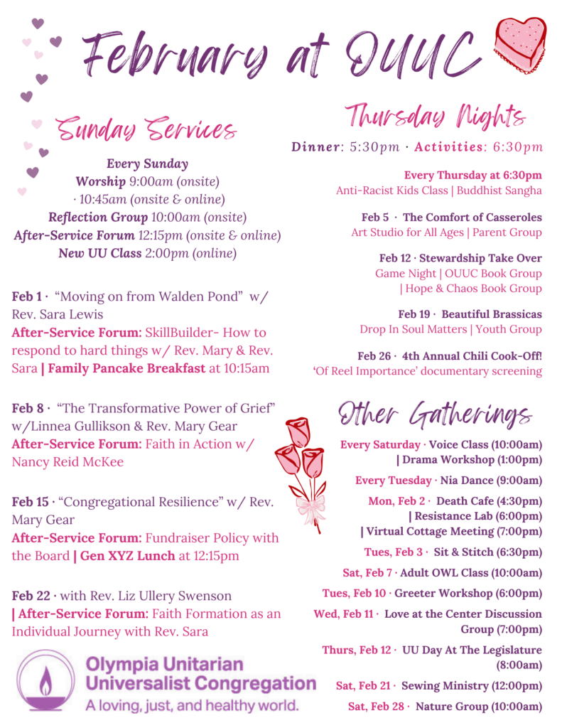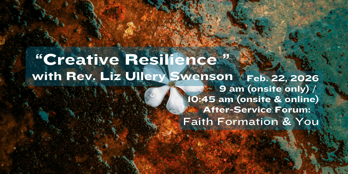 Home Service SliderFebruary Theme SliderCottage MeetingsService SliderVision of MinistryMinistry Focus ’25-’26 Welcome! Here you will find a liberal religious community – a spiritual home where people of all ages engage life’s big questions, find purpose and meaning, deepen and live our values, and serve the cause of justice in the wider community. Sunday Worship See Upcoming Service Info Upcoming Events Check the Events Flyer Visitors & Newcomers Plan Your Visit Resources for Congregants Realm Login Volunteer Training Forms