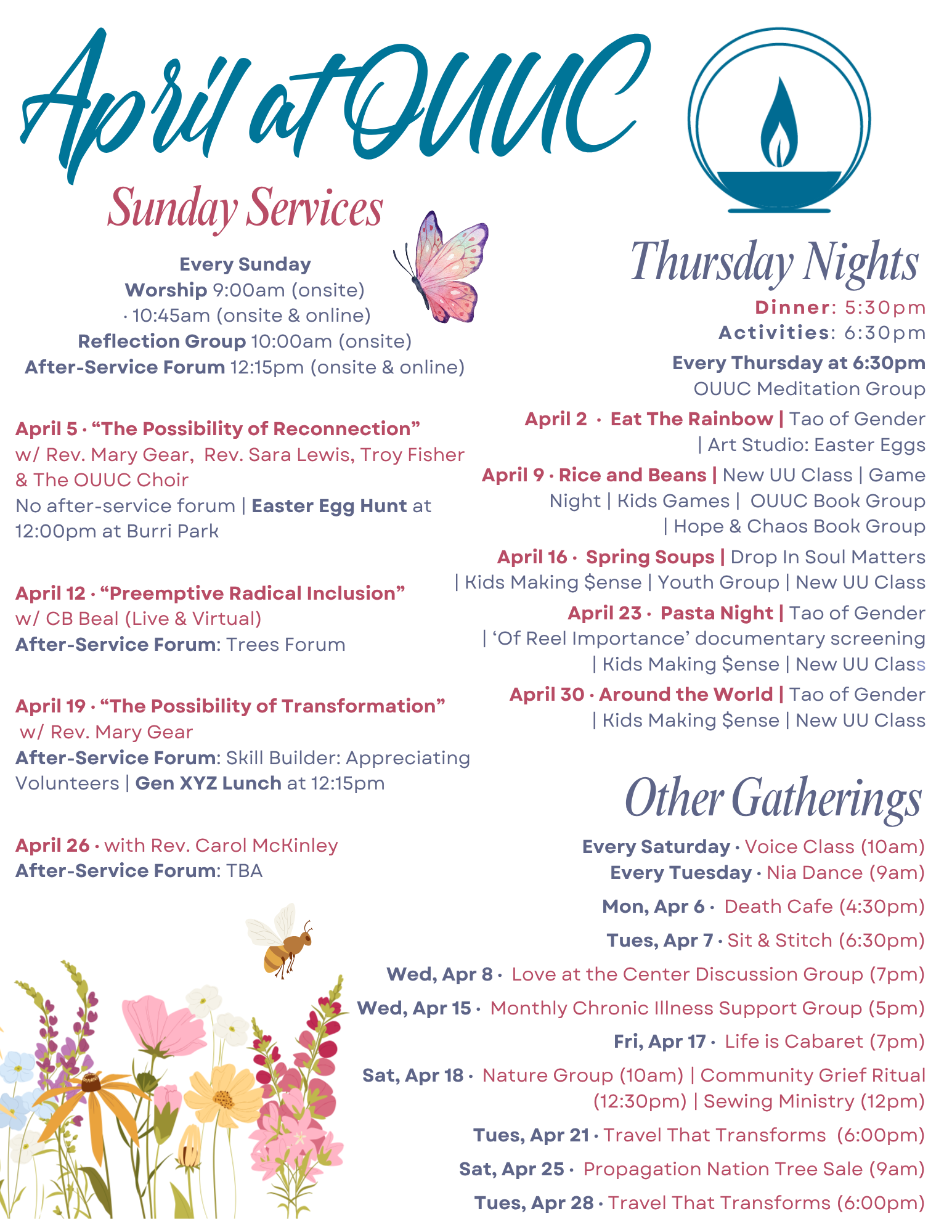 Home Service SliderMonthly Theme SliderSpiritual Practices SlideVision of MinistryMinistry Focus ’25-’26 Welcome! Here you will find a liberal religious community – a spiritual home where people of all ages engage life’s big questions, find purpose and meaning, deepen and live our values, and serve the cause of justice in the wider community. Sunday Worship See Upcoming Service Info Upcoming Events Check the Events Flyer Visitors & Newcomers Plan Your Visit Resources for Congregants Realm Login Volunteer Training Forms
