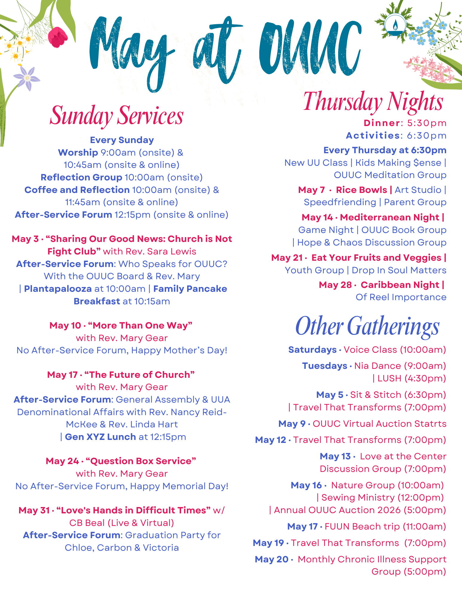 Home Service Slider2026 Auction SliderMonthly Theme SliderSpiritual Practices SlideVision of MinistryMinistry Focus ’25-’26 Welcome! Here you will find a liberal religious community – a spiritual home where people of all ages engage life’s big questions, find purpose and meaning, deepen and live our values, and serve the cause of justice in the wider community. Sunday Worship See Upcoming Service Info Upcoming Events Check the Events Flyer Visitors & Newcomers Plan Your Visit Resources for Congregants Realm Login Volunteer Training Forms